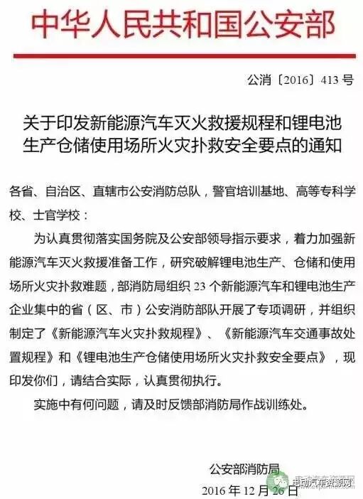 电动汽车资源网记者获悉,12月26日,公安部消防局发布《关于印发新能源汽车灭火救援规程和锂电池生产仓储使用场所火灾扑救安全要点的通知》(公消【2016】413号),内容涵盖《新能源汽车火灾扑救规程》、《新能源汽车交通事故处置规程》和《锂电池生产仓储使用场所火灾扑救安全要点》。具体内容如下: