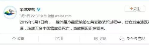 中新网3月2日电 据山东省荣成市人民政府新闻办官方微博消息,3月1日晚,一艘外籍冷藏运输船在荣喜港装卸过程中,货仓发生液氨泄漏,造成五名中国籍雇员死亡,事故原因正在调查。