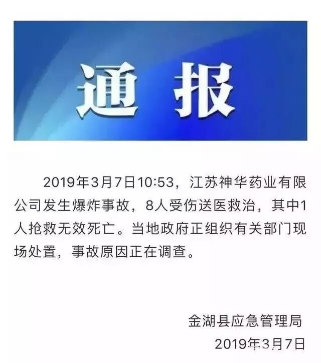 2019年3月7日10时53分,江苏神华药业有限公司发生爆炸事故,8人受伤送医救治,其中1人抢救无效死亡。当地政府正组织有关部门现场处置,事故原因正在调查。