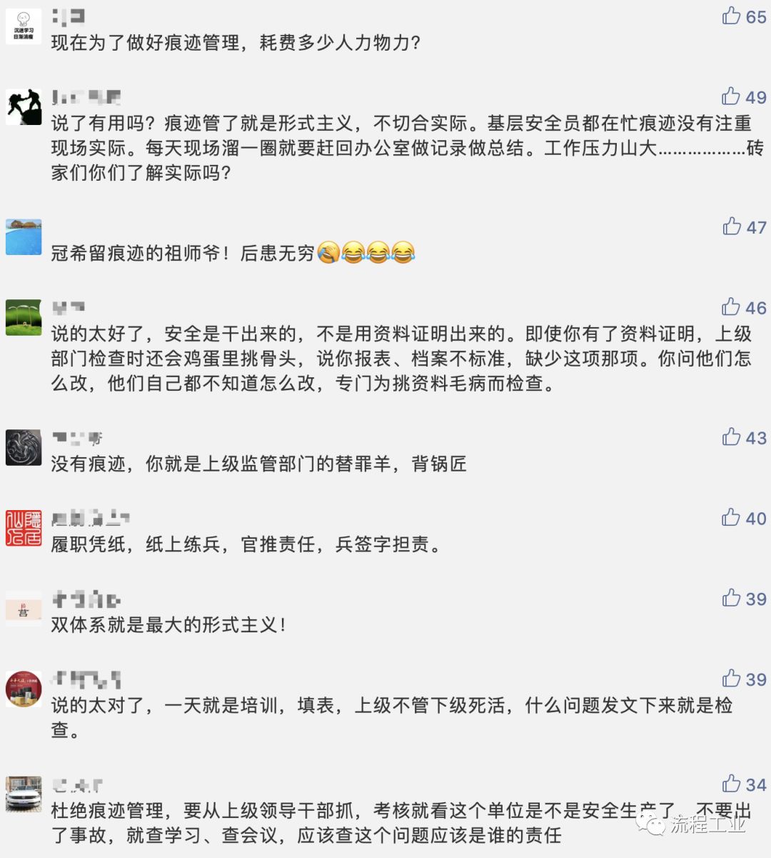 难道是为了证明确实学习了吗?基层一线的生产人员,很多精力都被“痕迹”所耗费,真正能投入到安全生产的精力可想而知,整个安全生产管理体系一直运行在一个非常低的“功率因数”上,这就是现在安全生产管理处于瓶颈的主要原因。如果说近些年来我们一直在做加法的话,那么现在确实到做减法的时候了。