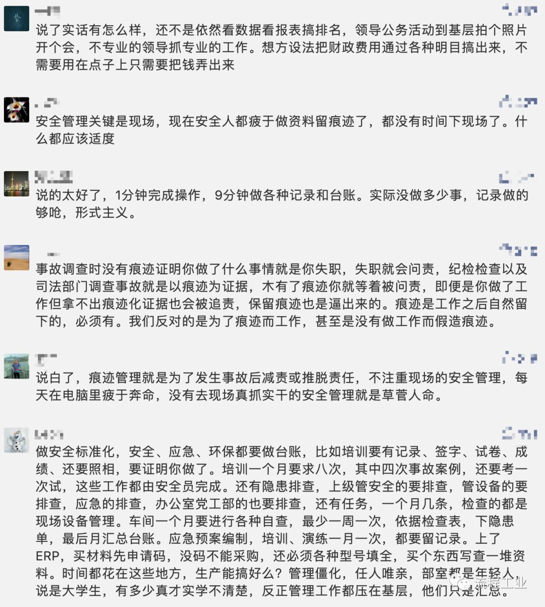 不得不说现在的安全工作是在走“形式主义”“痕迹主义”,现在绝大多数企业将这项工作做给政府、做给上级监管部门看。这些年看似安全工作得到“史诗级”重视,却不见事故明显减少,相信只有企业及监管部门清楚自己的病根!