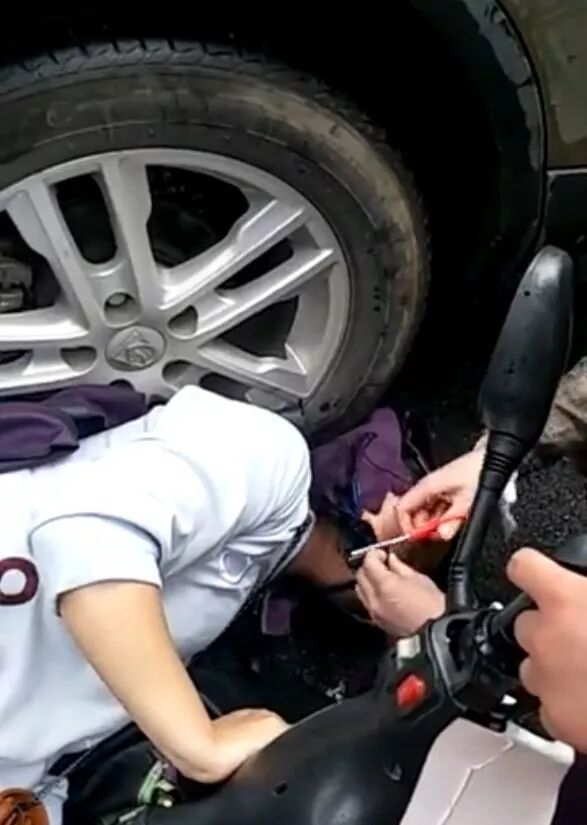 但走近现场后看到了惊人的一幕:一位电动车车主身陷小车车轮底下,其雨衣及头发被小车右后轮胎紧紧压住,无法动弹。电动车车主喉咙被压住的雨衣死死紧箍住,造成电动车车主呼吸困难、脸色苍白,情况十分危急。而另一名热心女市民正在使用剪刀,以帮助电动车女车主摆脱险境。