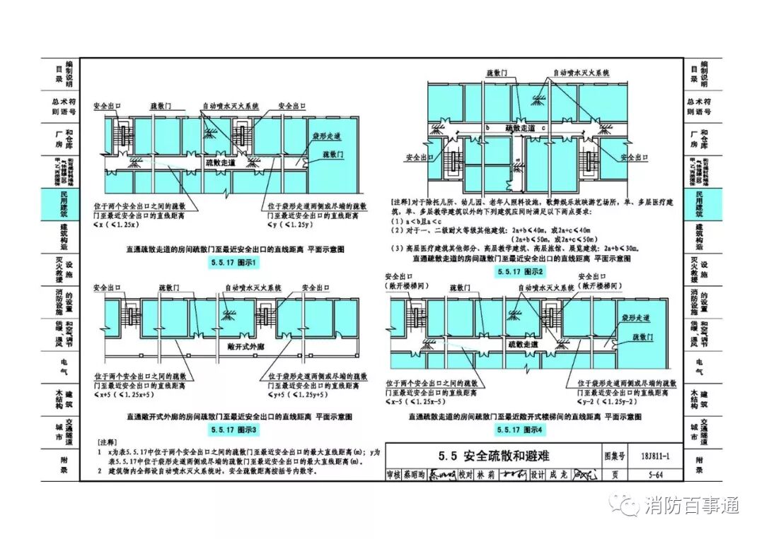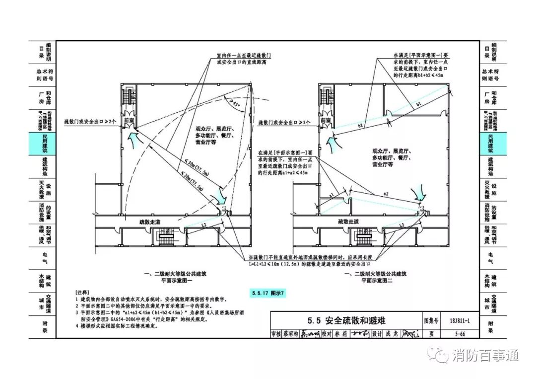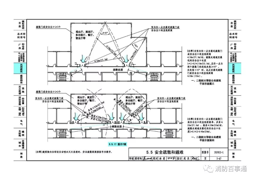 5、5-67页:修改5.5.17图示7续中室内任一点至最近疏散门或安全出口的直线距离的标注及该图示的注释。