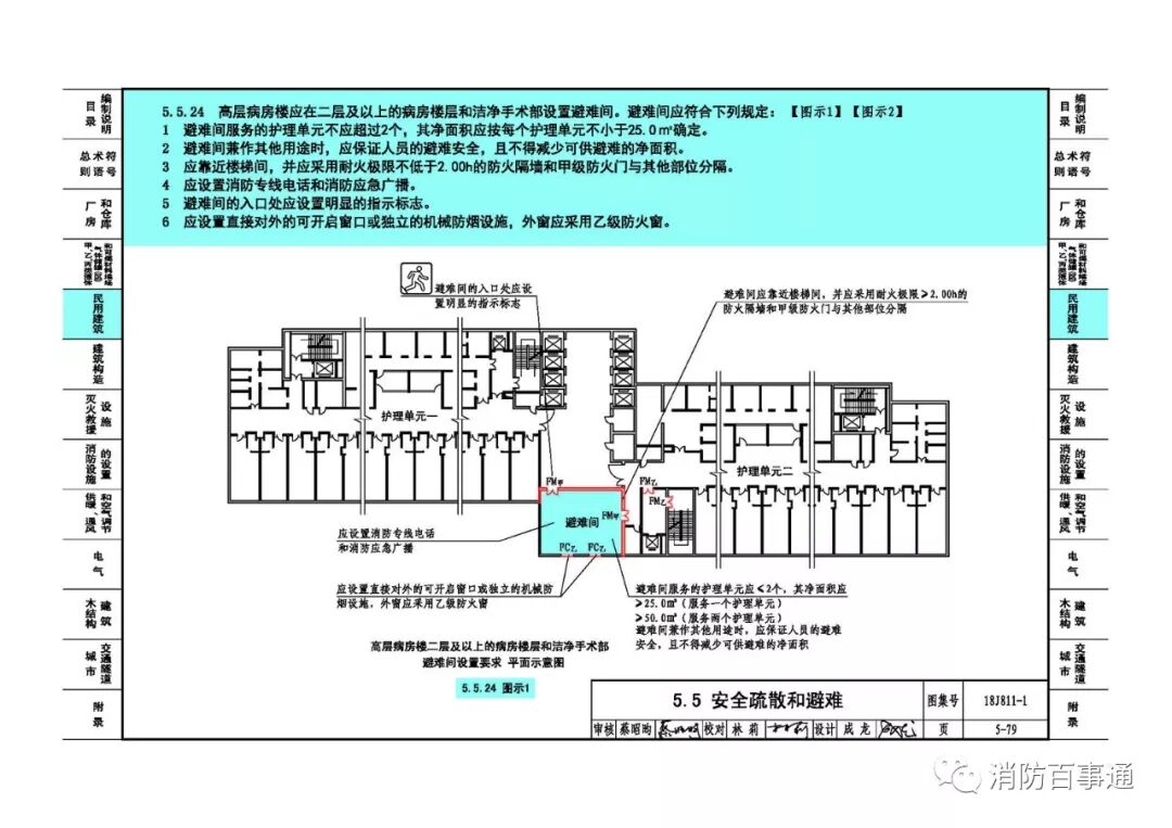 7、5-79页:修改5.5.24图示1中避难间的入口处应设置明显的指示标志索引线的位置。