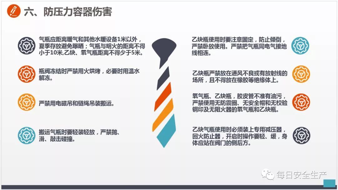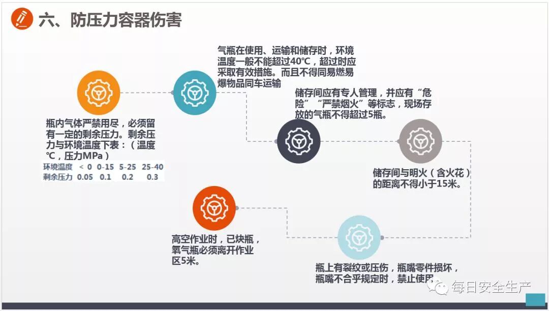 用有油脂的手套、棉纱和工具接触氧气瓶、瓶阀、减压器及管路等。或戴油脂手套从事切割作业。使用氧气瓶、乙炔气瓶时,气瓶安全附件没有或不齐或安全距离不符和要求。 |