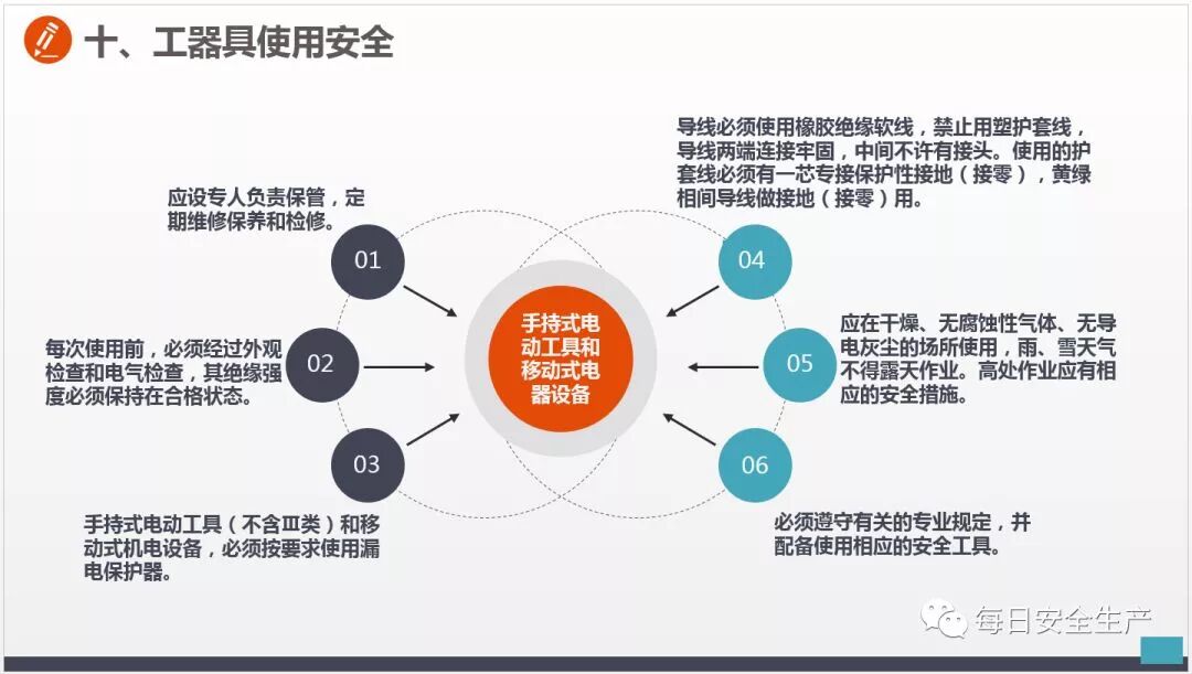 使用有安全隐患的各类设备和工具,如:未可靠接地(零)的电动工具、电焊机、破损的绝缘手套、雨鞋、工具等 |