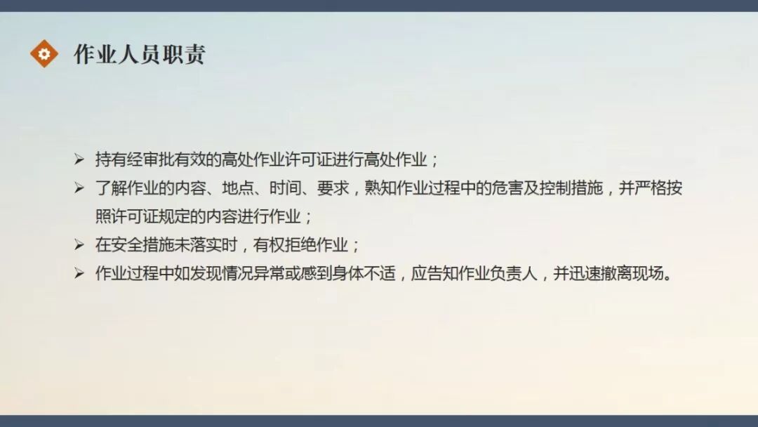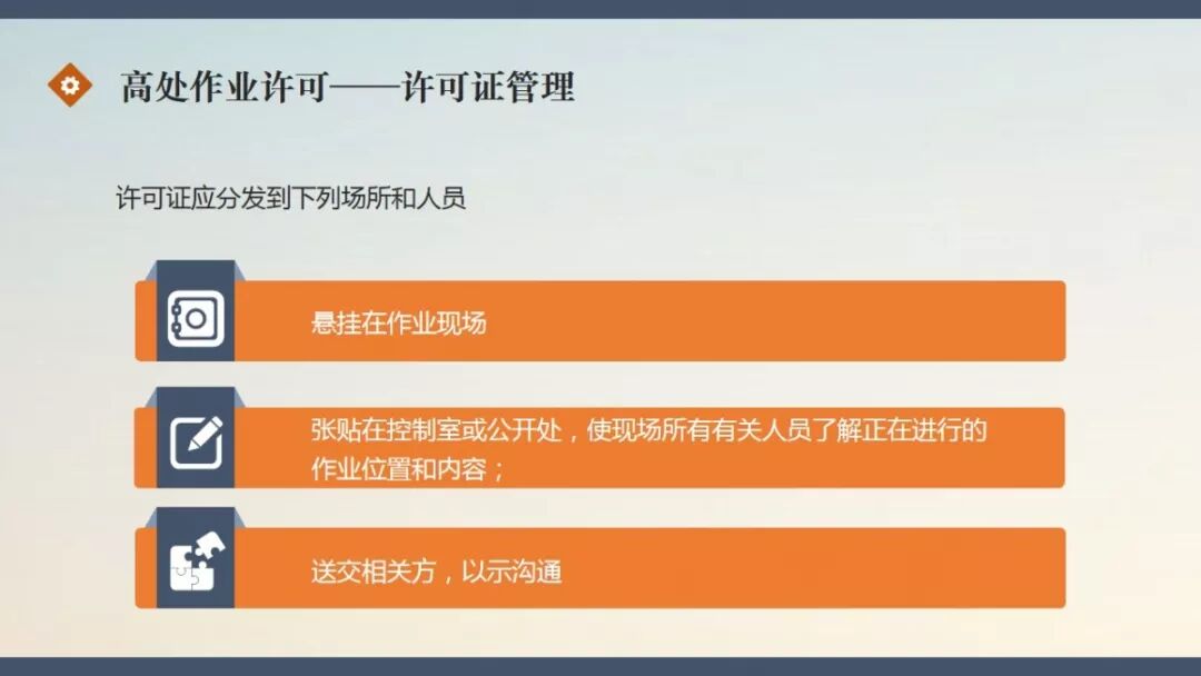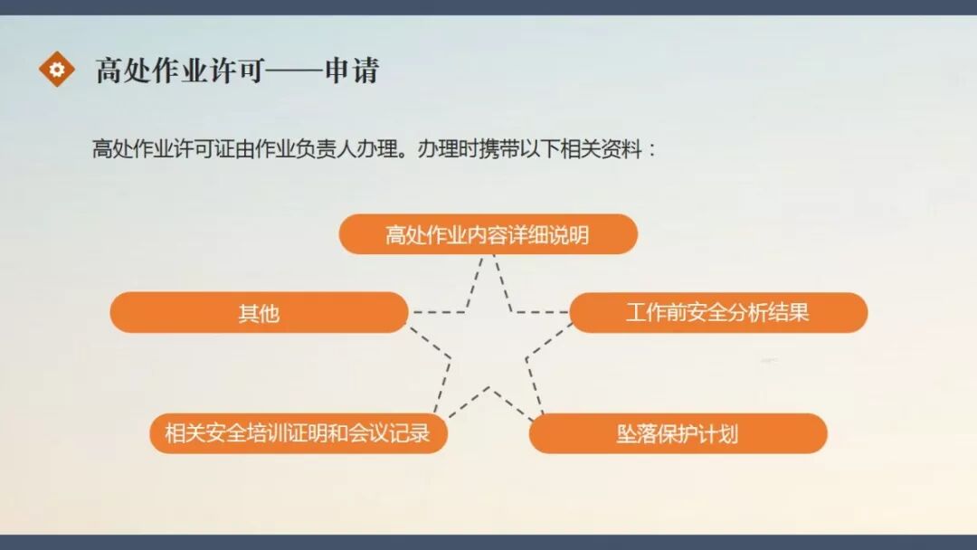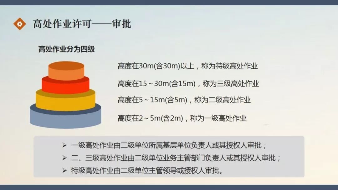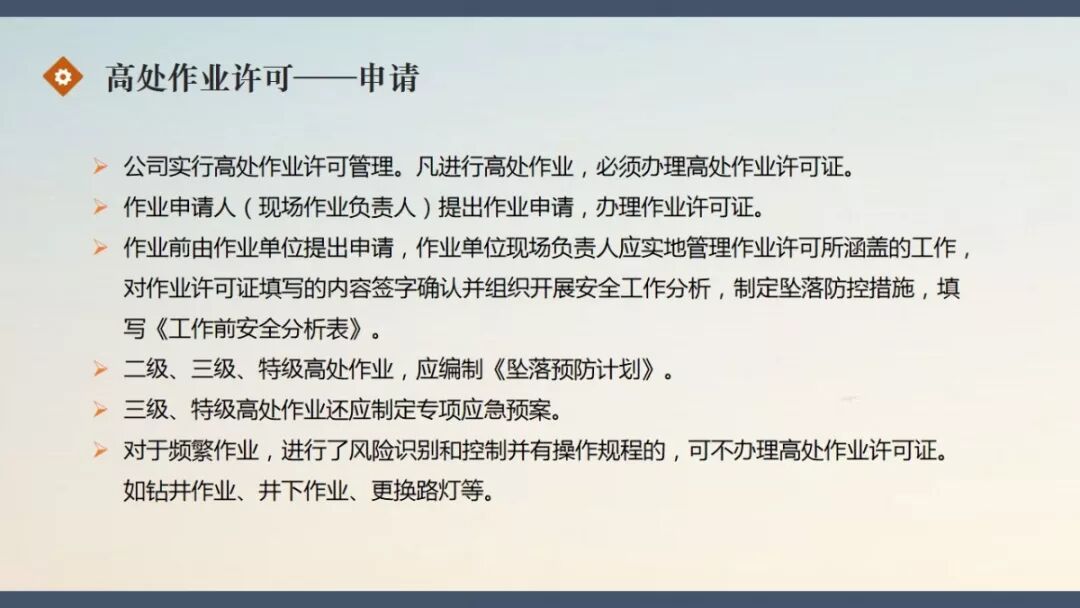 链接:PPT | 高处作业许可管理实施细则 https://mp.weixin.qq.com/s?__biz=MzI5MTQxMTc0OQ==&mid=2247494201&idx=1&sn=db936ab1b71309dc3bc8c6cf5fbc03df&chksm=ec13a873db642165e42e84ac33f0dce4466277b5ec5f420e7928c462356a748d8af02827463b&mpshare=1&scene=23&srcid=&sharer_sharetime=1566865520021&sharer_shareid=d9fdcc60a46951fed6d7a0bbdd004814#rd