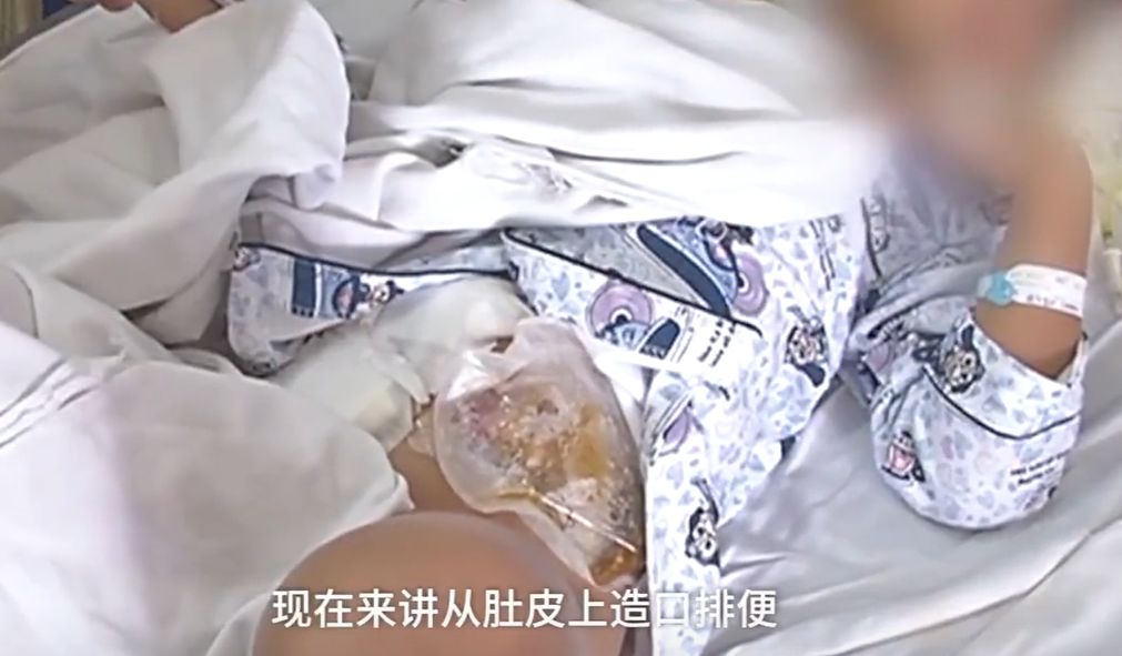 医生介绍,男童一期的恢复比较差,为了帮助肠子愈合、减轻水肿,医生在男孩的肚皮上造口排便。