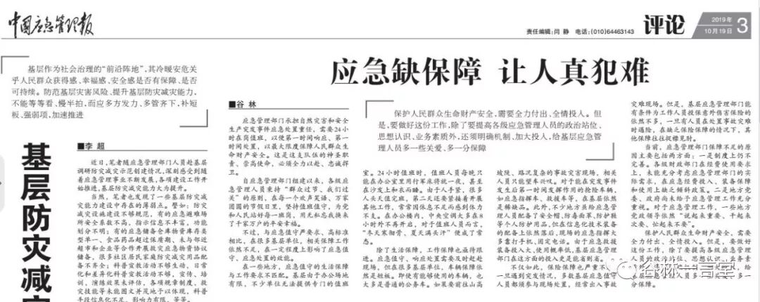 本文由谷林一言堂公众号2019年10月5日刊出的《应急保障现状堪忧》删减,刊于2019年10月19日《中国应急管理报》。