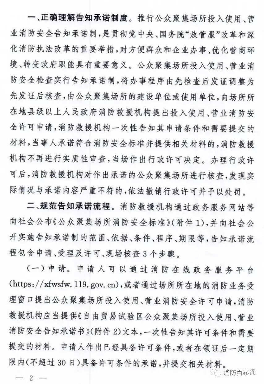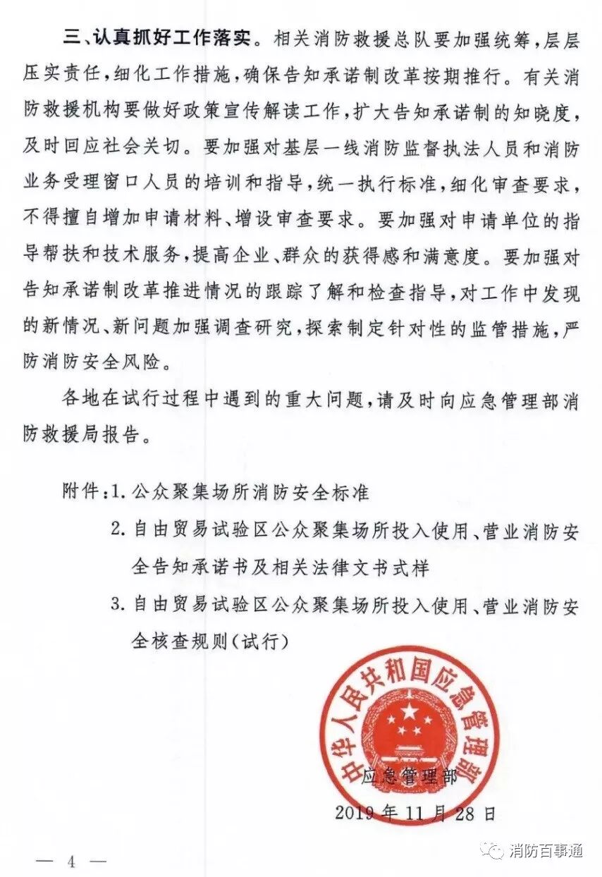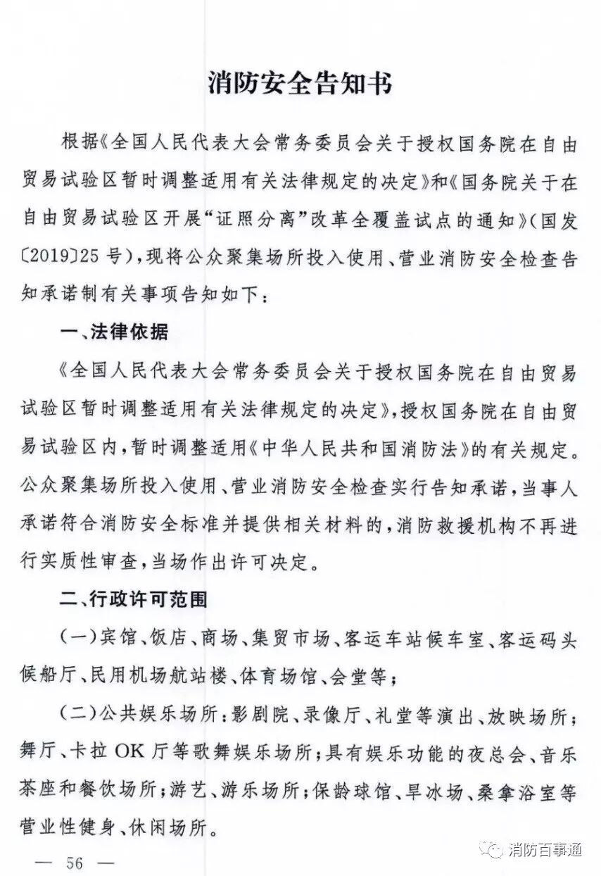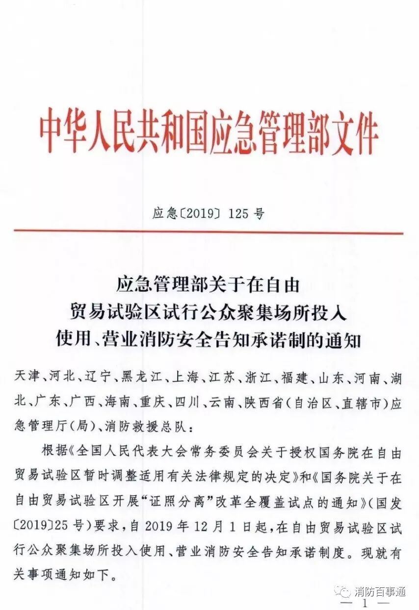 近日,《应急管理部发布关于在自由贸易试验区试行公众聚集场所投入使用、营业消防安全告知承诺的通知》发布。