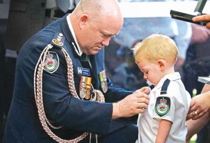 32岁的消防员Geoffrey Keaton是三人中的一员,他被一颗烧焦的大树砸中车辆身亡。1月2日,在他的葬礼上,19个月大的儿子咬着奶嘴,代替他领荣誉勋章,场面令人动容。