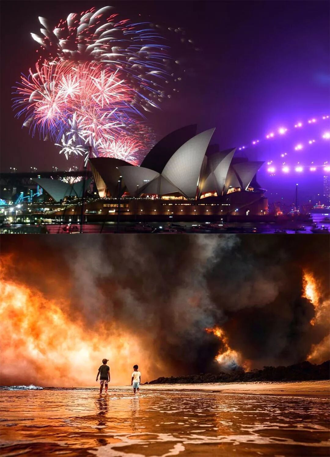 一边是人民在大火滔天下等待救援,另一边是璀璨夺目的烟花四起。