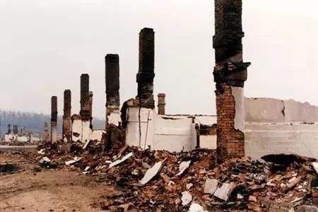 居民楼被烧得只剩断壁残垣,铁轨被烧弯,废铁被烧化,凝成铁坨子……