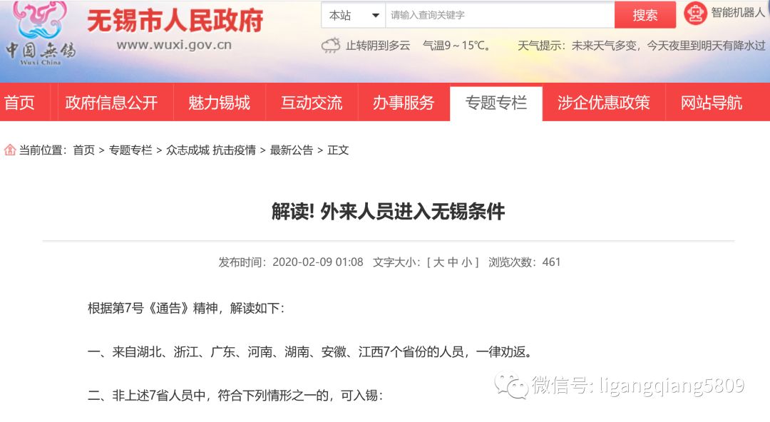 昨日,江苏无锡根据当地第7号《通告》精神规定来自湖北、浙江、广东、河南、湖南、安徽、江西7个省份的人员,一律劝返。