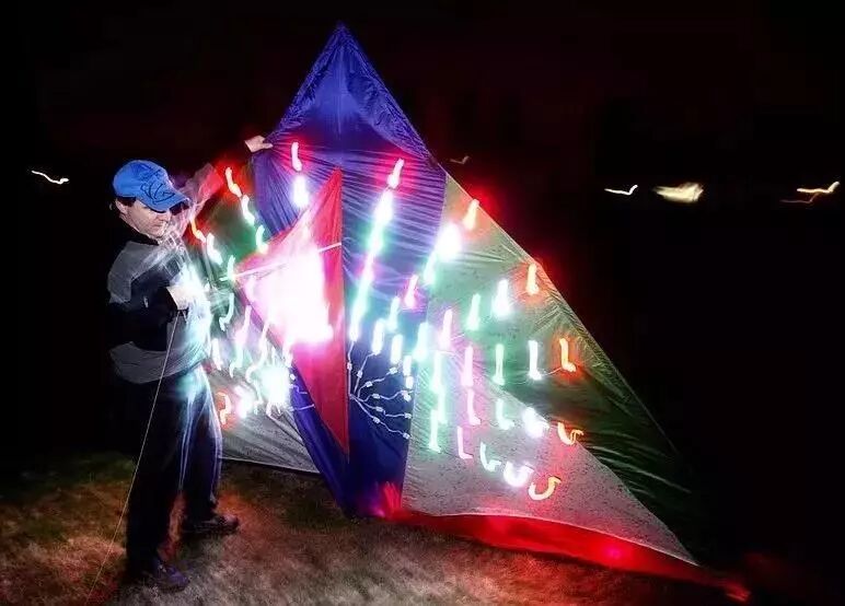 夜光风筝发光的方法很简单,就是一个充电电池+LED灯,有些大风筝的灯是直接缝在帆布上的,而有些小风筝就直接用夹子把灯夹在上面,而电池就用胶布贴在风筝骨上。这样一装饰,好看是好看了,但加了灯之后,风筝的危险系数也直线上升了。夜光风筝飞上高空后,如果遇到小雨或者潮湿的空气,很可能导致电线短路,引发电池爆炸及触电风险。