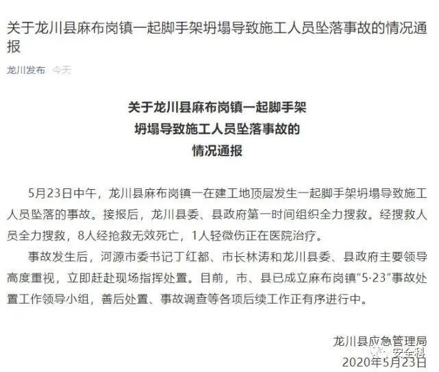 5月23日中午,龙川县麻布岗镇一在建工地顶层发生一起脚手架坍塌导致施工人员坠落的事故。接报后,龙川县委、县政府第一时间组织全力搜救。经搜救人员全力搜救,8人经抢救无效死亡,1人轻微伤正在医院治疗。