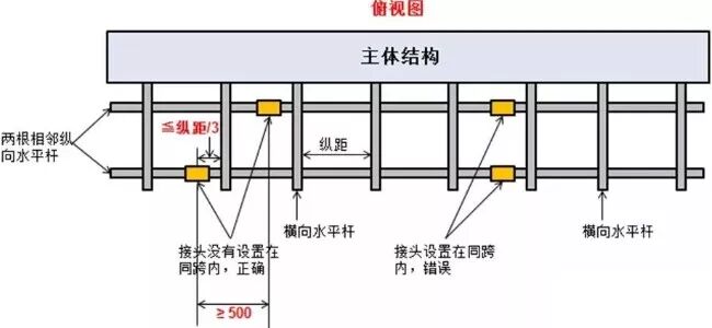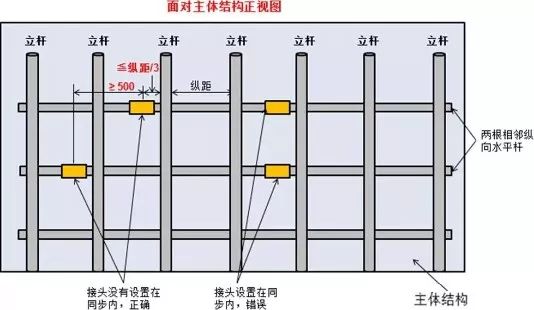 6、两根相邻纵向水平杆的接头不应设置在同跨内,不同跨两个相邻接头在水平方向错开的距离不应小于500mm,各接头中心至最近主节点的距离不应大于纵距的1/3。