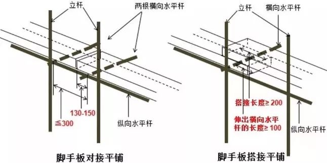 13、脚手板对接平铺时,接头处必须设两根横向水平杆,脚手板外伸长应取130~150mm,两块脚手板外伸长度之和不应大于300mm;脚手板搭接铺设时,接头必须支在横向水平杆上,搭接长度不应小于200mm,其伸出横向水平杆的长度不应小于100mm。