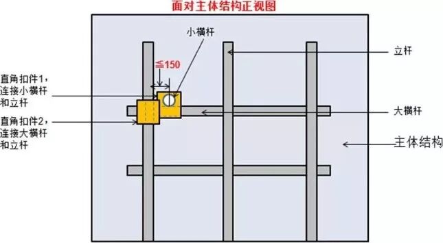 9、主节点处的两个直角扣件的中心距不应大于150mm。