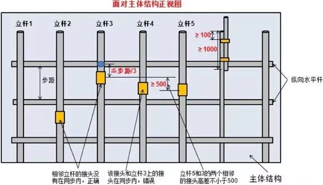 5、两根相邻纵向水平杆的接头不应设置在同步内,不同步两个相邻接头在水平方向错开的距离不应小于500mm,各接头中心至最近主节点的距离不应大于纵距的1/3。