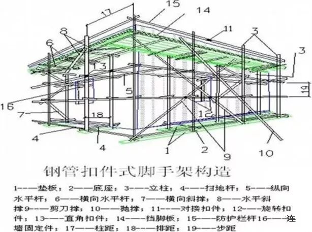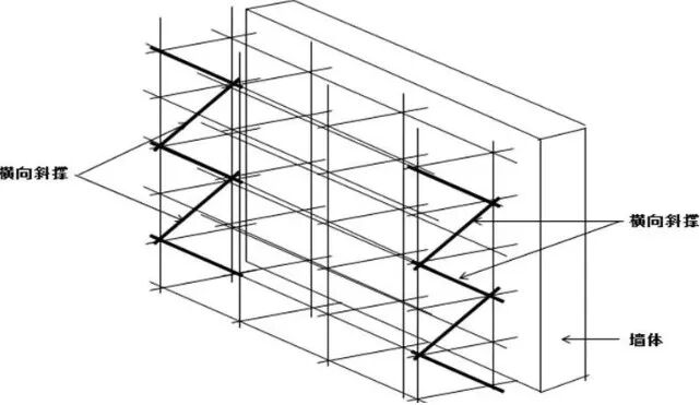 18、开口形双排脚手架的两端均必须设置横向斜撑。