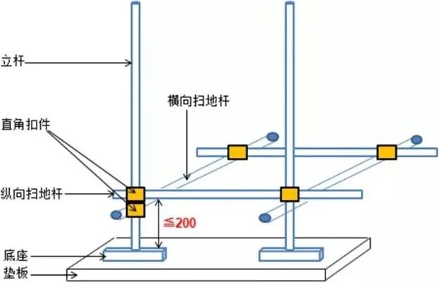 14、纵向扫地杆应采用直角扣件固定在距底座上皮不大于200mm处的立杆上。横向扫地杆宜采用直角扣件固定在紧靠纵向扫地杆下方的立杆上。