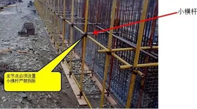 8、主节点处必须设置一根横向水平杆(小横杆),用直角扣件扣接且严禁拆除。