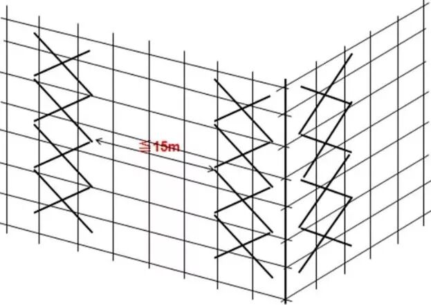 19、髙度在24m以下的单、双排脚手架,均须在外侧两端、转角及中间不超过15m的立面上,各设置一道剪刀撑,并应由底至顶连续设置。