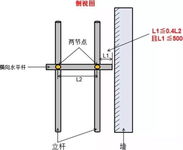 10、在双排脚手架中,离墙一端的外伸长度不应大于0.4 倍的两节点的中心长度,且不应大于500mm。