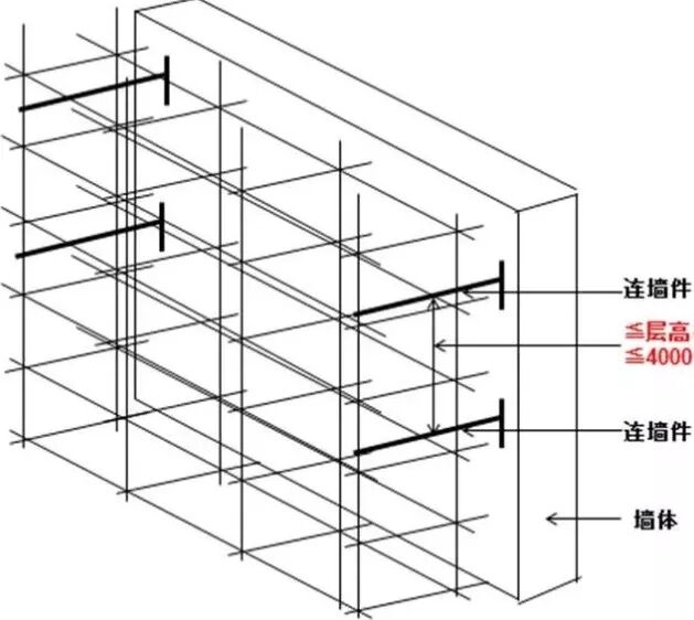 17、开口形脚手架的两端必须设置连墙件,连墙件的垂直间距不应大于建筑物的层高,且不应大于4m。(沿建筑周边非交圈设置的脚手架为开口型脚手架,一般建筑的外围脚手架沿建筑周圈连续布置,成一封闭整体,如山墙上的脚手架,不但与主体结构拉结,还在两端与正立面和背面脚手架连在一起。)