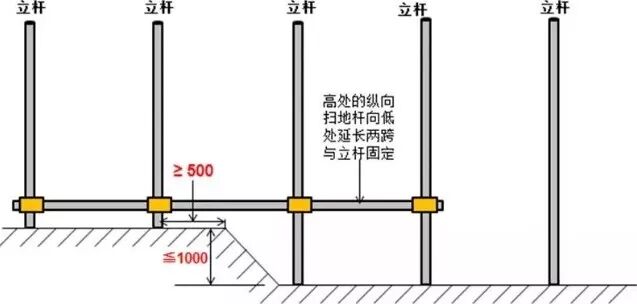 15、当立杆的基础不在同一高度上时,必须将高处的纵向扫地杆向低处延长两跨与立杆固定,高低差不应大于1m,靠边坡上方的立杆轴线到边坡的距离不应小于500mm。