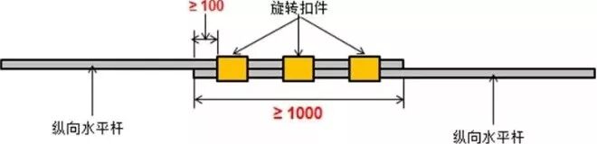7、纵向水平杆搭接长度不应小于1m,应等间距设置3个旋转扣件固定,端部扣件盖板边缘至搭接纵向水平杆杆端的距离不应小于100mm。
