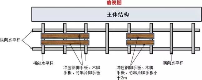 12、冲压钢脚手板、木脚手板、竹串片脚手板等,应设置在三根横向水平杆上。当脚手板长度小于2m时,可采用两根横向水平杆支撑,但应将脚手板两端与其可靠固定,严防倾翻。