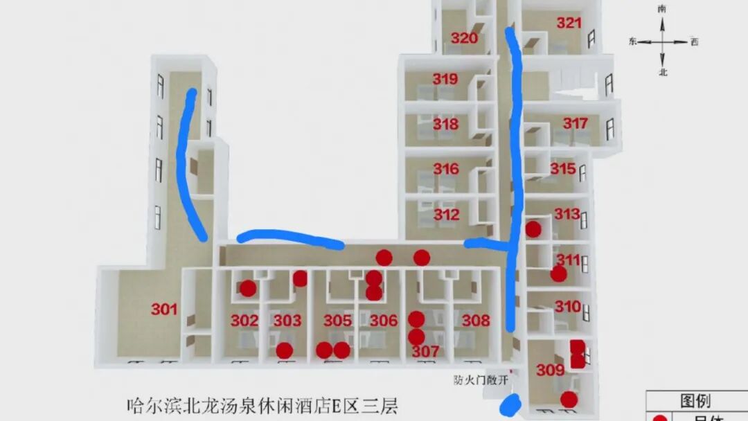 (4)三楼死亡16人。就是这扇没关的防火门,使有毒烟气长驱直入(看上图,沿蓝色线条),窜入三楼走廊,并进入各个房间。我们看到有8个房间死亡了14人,这其中302、306、309、313房间有6名客人躲入卫生间,但仍然没有逃脱毒气。此外,有2人冲出房间后,遭遇浓烟死亡在走廊上。