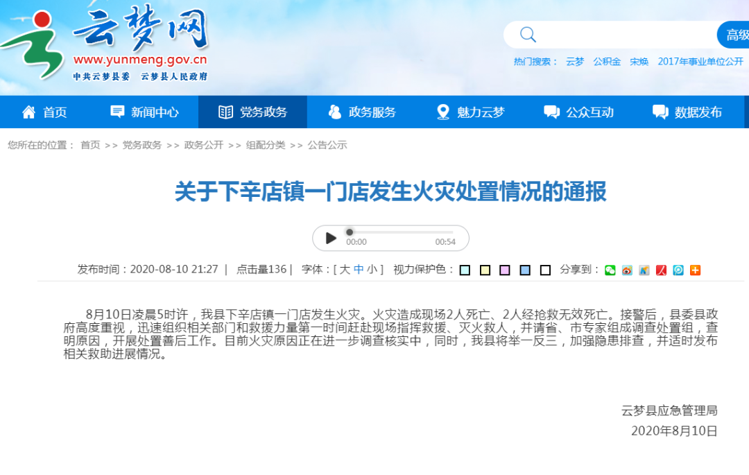 8月10日凌晨5时许,湖北云梦县一门店发生火灾。火灾造成现场2人死亡、2人经抢救无效死亡。