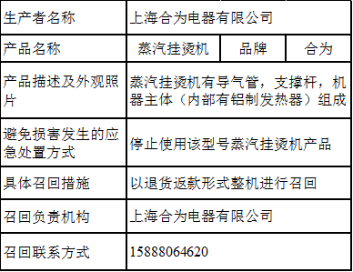 上海合为电器有限公司将召回2020年3月13日 - 2020年5月10日期间生产规格/型号为220V 50Hz 2000W/H-508的蒸汽挂烫机(生产批号/批次:2020-03-13),涉及数量:27件。