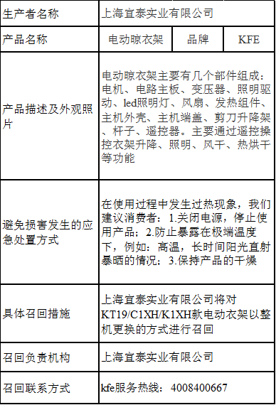 上海宜泰实业有限公司将召回2019年7月5日 - 2020年7月21日期间生产,规格/型号为KT19/C1XH/K1XH的电动晾衣架(生产批号/批次:SC19A/ SC19B/ SC19C),涉及743件。