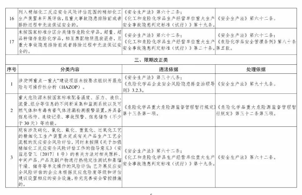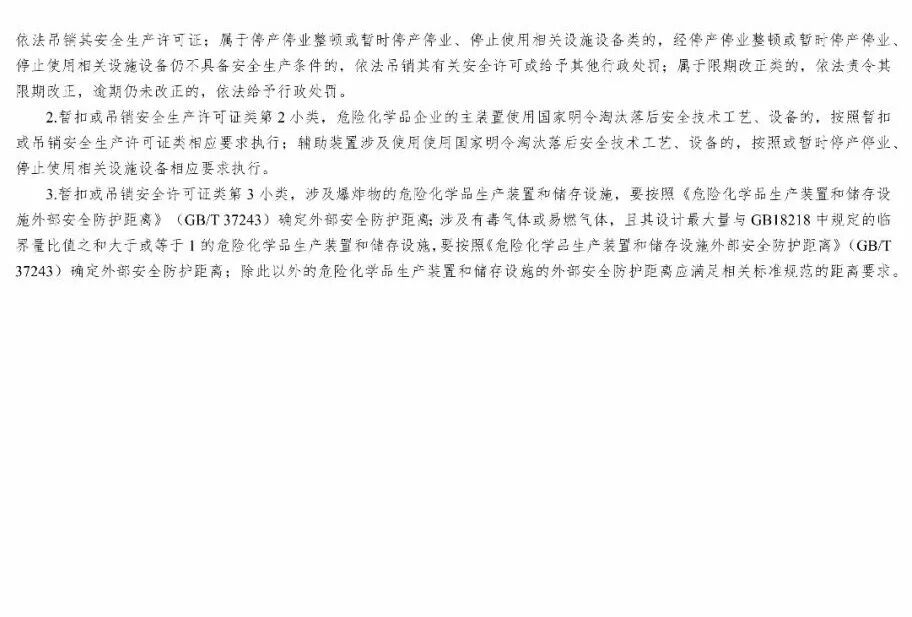 三、《目录》作为对危险化学品企业安全实施分类整治的重要依据,各地区应急管理部门可结合实际研究制定本地区详细目录和实施办法。要严格按照法律、法规、规章、标准的有关具体规定,区分规范达标、改造提升、依法退出三类情况,明确分类内容、违法依据和处理依据。